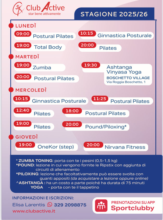 ° ACQUAGYM e NIRVANA: queste lezioni non sono comprese in carnet o abbonamenti e si pagano in loco; in caso di maltempo saranno annullate.